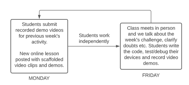 Since I am working with a large group of students during that weekly 80 minute slot it was a constant battle in the first semester to ensure I am giving each of them individual attention. Some weeks were better than others but the personal one-to-one connect a teacher needs to engage with each student’s individual needs was not working. This model, however, has taken care of that. Not only am I able to keep a better eye on their learning process, I am also getting some useful feedback from the students on what works best for their learning needs. Hence, on Fridays I am able to put them into custom pairs/teams and go around helping everyone. Some kids choose to use that lesson to record video demos, others choose to catch up on pending work, while those who did complete their work on time are stepping up to help their friends! This collaborative nature of the class is slowly but surely addressing some of the communication issues from last semester.