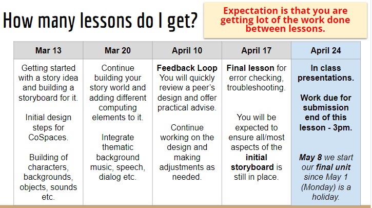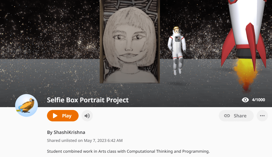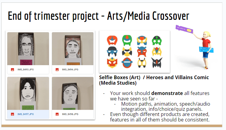Since all Computing students have an elective of either Arts or Media Studies, this project had some kids working on a virtual gallery walk through of their selfie box portraits in Art and others built an animated rendition of their Superhero comic idea from Media Studies. Both these approaches required them to use algorithms to logically breakdown their presentations into scenes and events with code blocks. Here are a couple of student work samples. I have made copies of their work to preserve student anonimity.