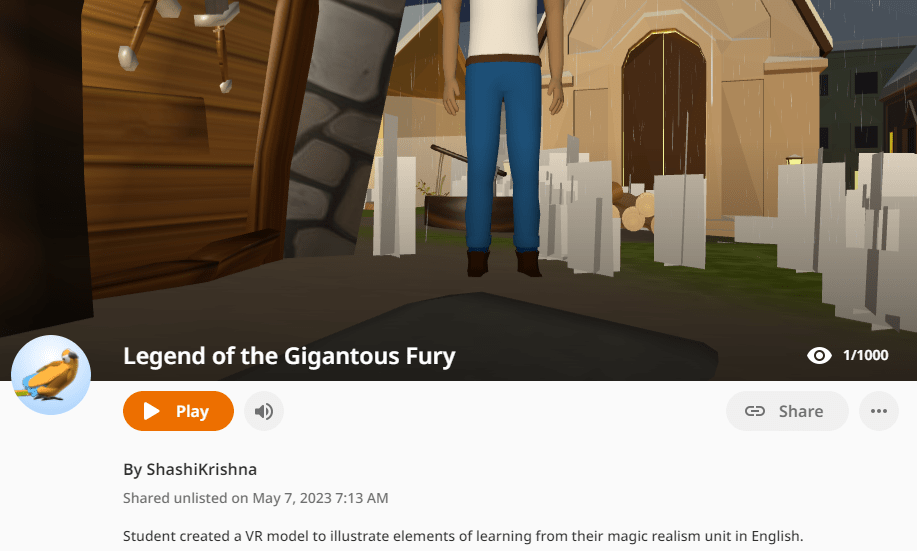 Students need worked on a wide range of ideas and approaches to make this happen. Some kids chose a single chapter or event from the book and created a VR rendition of it. Others made up their own story with elements of subtle (and not so subtle!) magic realism embedded into it. Here are a couple of examples of what the students created.
