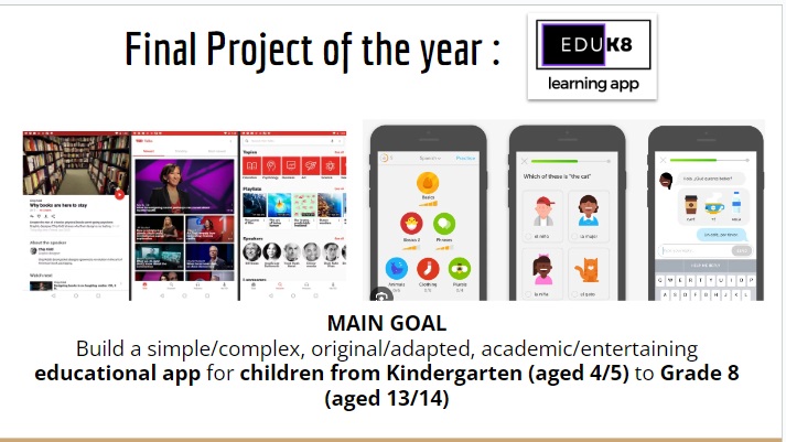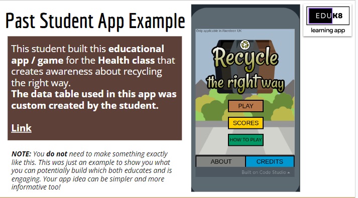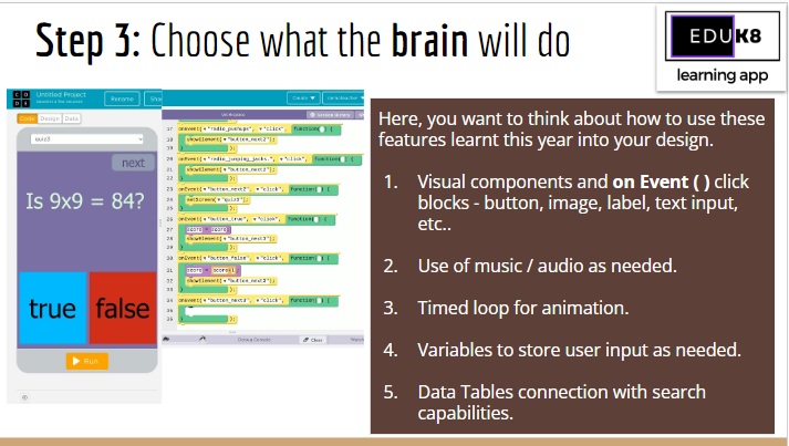 The final end of term project the students developed was an educational app that was aimed at a specific subject and topic. With the very limited time they had some really interesting examples came out. The requirement was that they use as many features from computational skills as they could. Slides on the basic guidance they got are given below.